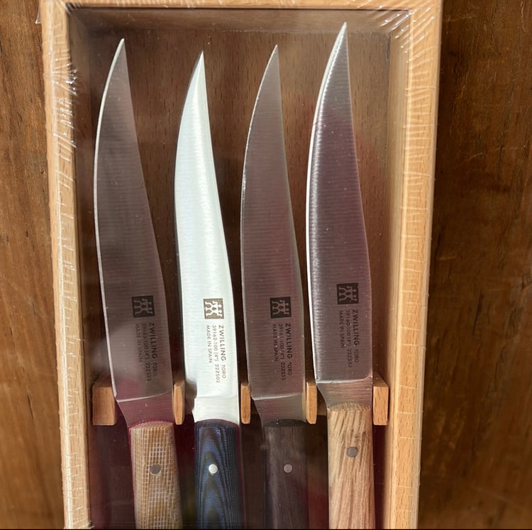 Effortlessly slice through meat and poultry with our extensive selection of steak knives, available in sets or individually. We offer fine edge serrated, and semi-serrated steak knives available with wooden handles, stainless-steel handles, and more. And many sets are handsomely packaged in presentation cases that are ideal for gifting.