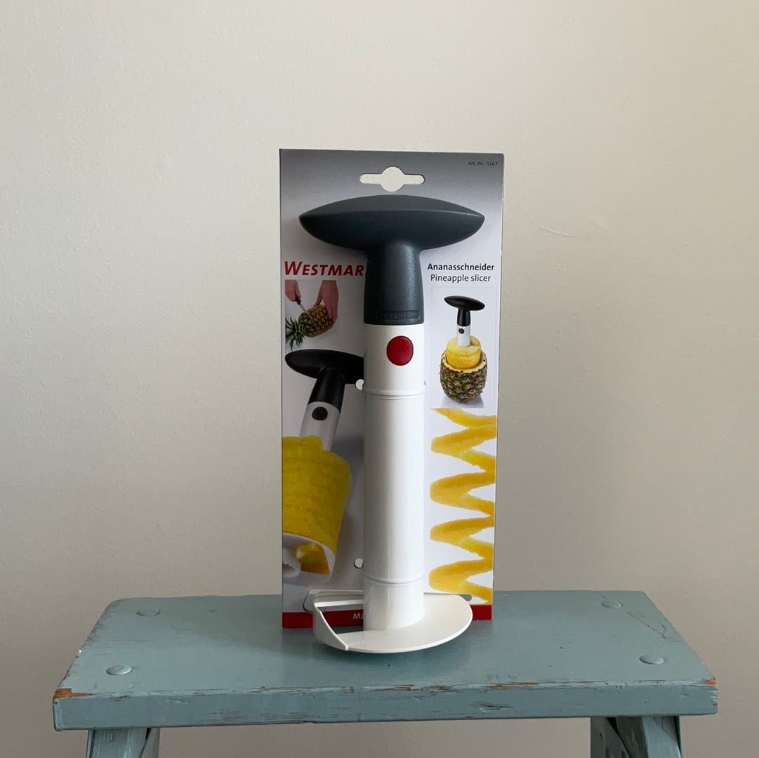 The practical pineapple slicer cores, peels and slices whole pineapple fruit in just one simple step for fine fruit salads, fruit plates, and desserts. By screwing the slicer into the pineapple, you are able to cut spirally into the fruit flesh while removing seeds at the same time. The sharp, serrated cutting ring made of stainless steel makes it easy to pierce and hollow out the pineapple. The freshly cut spiral can be transformed into ready-to-serve slices. Advantage: the rind remains intact so that you have no loss of juice. The hollowed pineapple skin can be used as a container.