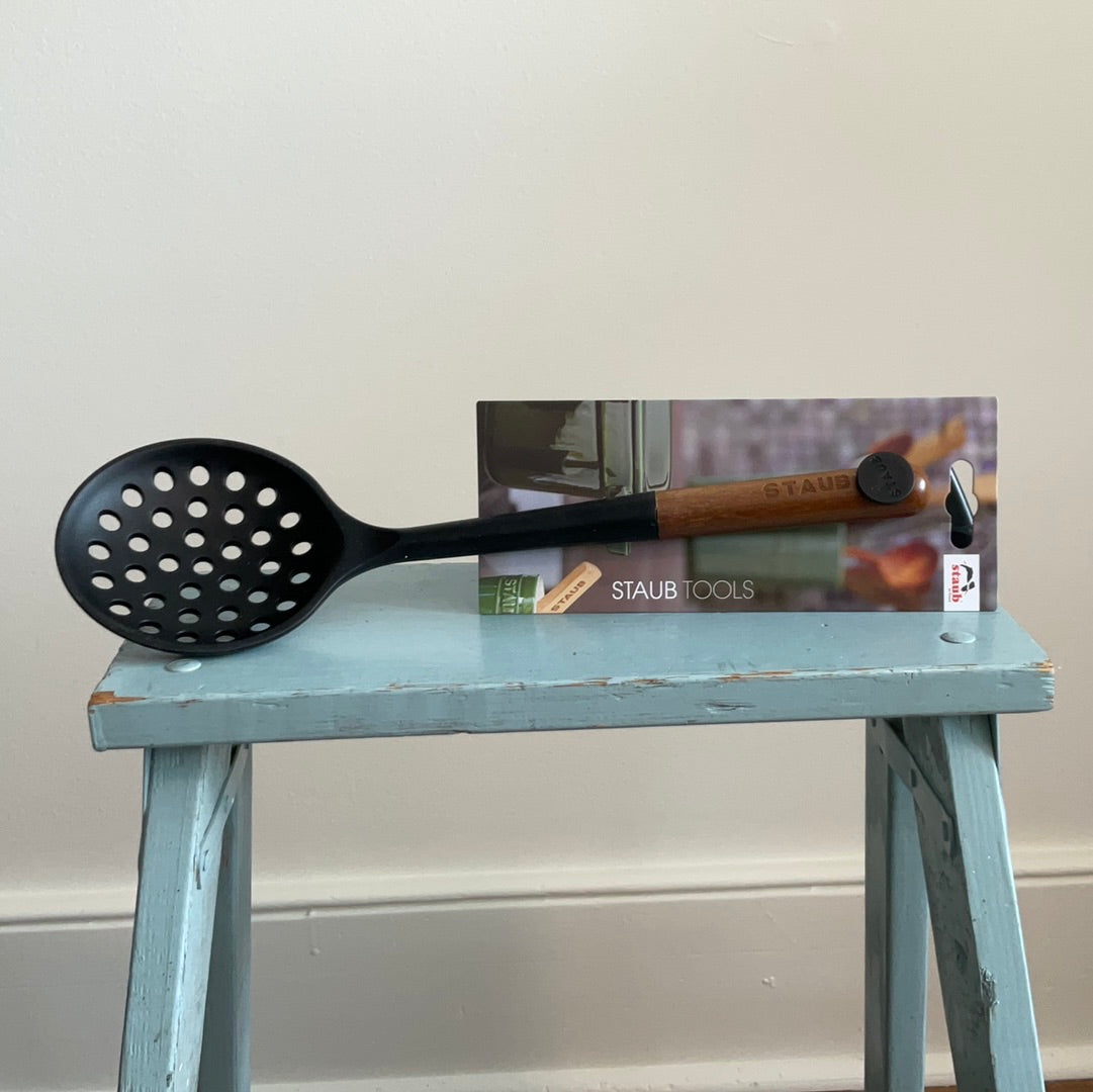 Exquisite and ergonomic, this Staub skimming ladle are perfectly contoured to fit the hand, pot, and bowl. Safe to use on all cookware surfaces, this full range of kitchen essentials is made from long-lasting black matte silicone and eco-friendly Acacia wood.