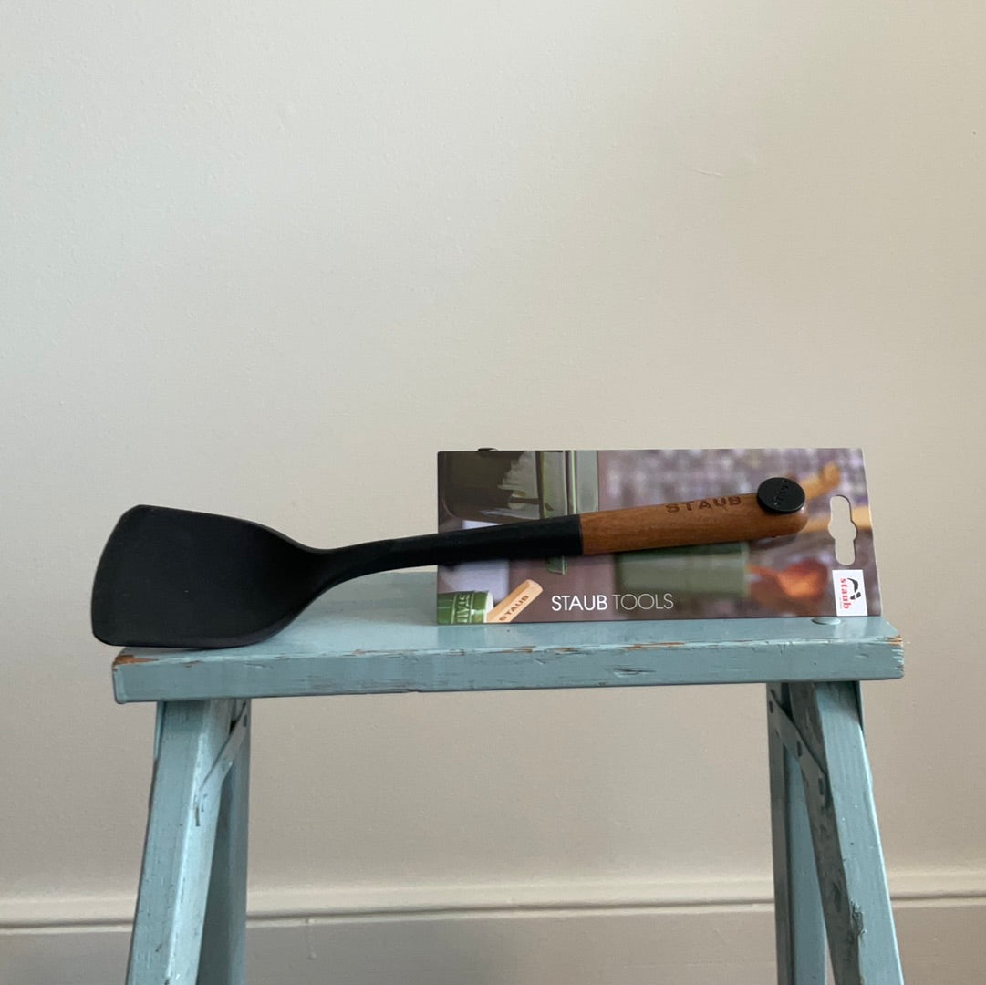 Exquisite and ergonomic, this Staub turner are perfectly contoured to fit the hand, pot, and bowl. Safe to use on all cookware surfaces, this full range of kitchen essentials is made from long-lasting black matte silicone and eco-friendly Acacia wood.