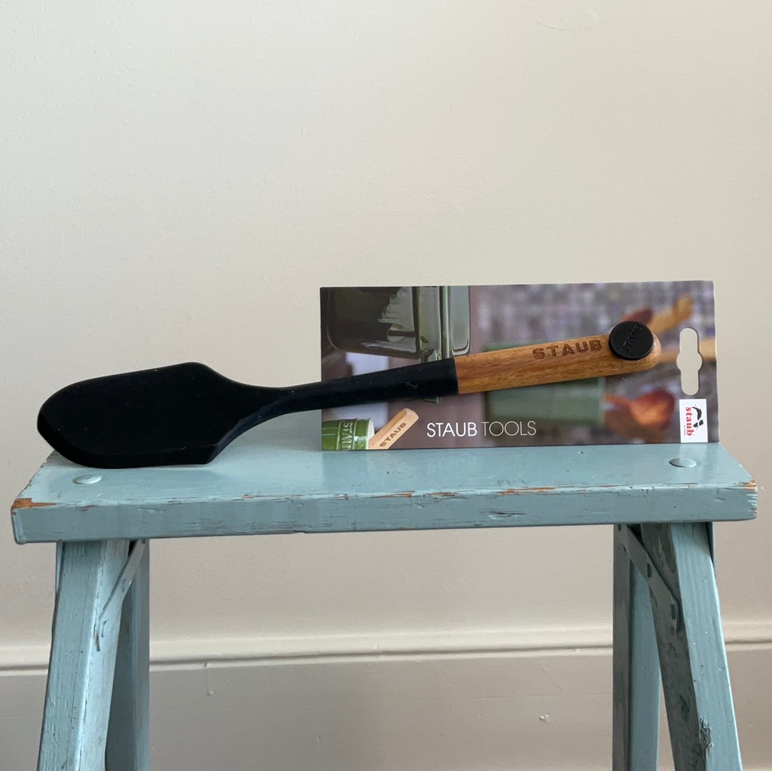 Exquisite and ergonomic, this Staub spatula are perfectly contoured to fit the hand, pot, and bowl. Safe to use on all cookware surfaces, this full range of kitchen essentials is made from long-lasting black matte silicone and eco-friendly Acacia wood.