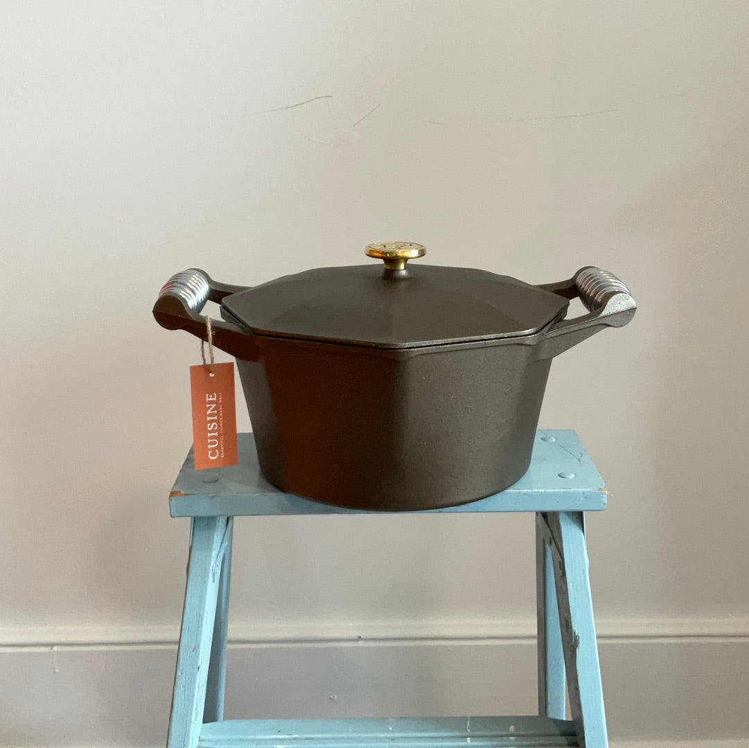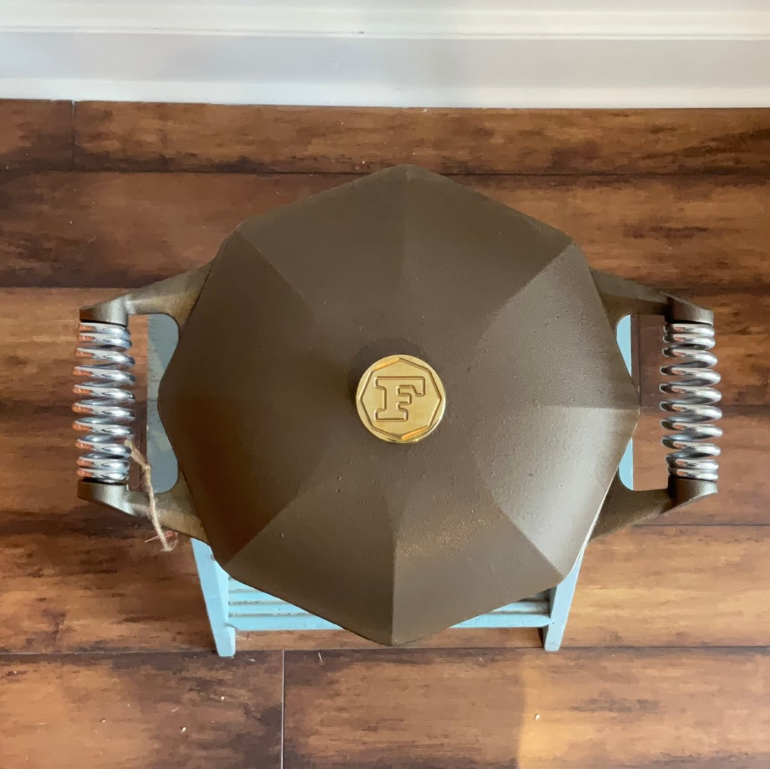 FINEX Dutch ovens bring high end design to a classic cast iron heirloom. Heavyweight construction ensures even-cooking heat retention and distribution on any stove top, oven or over- the-coals cooking scenario. Octagonal shape offers spouts that pour easily yet are completely covered by the included lid. Dual stainless steel Speed Cool spring handles make them easy to bring to the table.