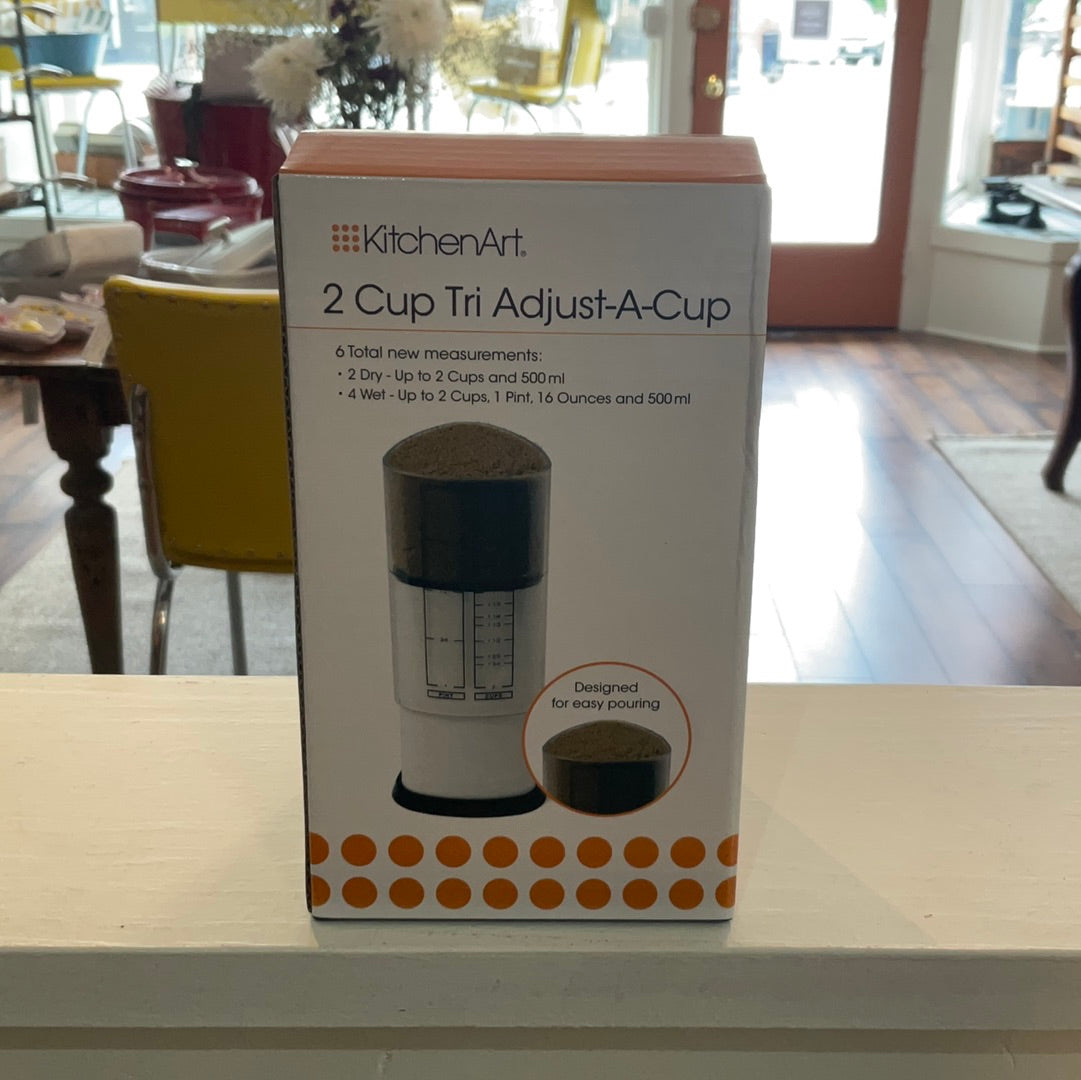 2 cup adjust a cup for liquid and dry ingredients. Updated shape for easy controlled pouring. 2 dry & 4 wet.