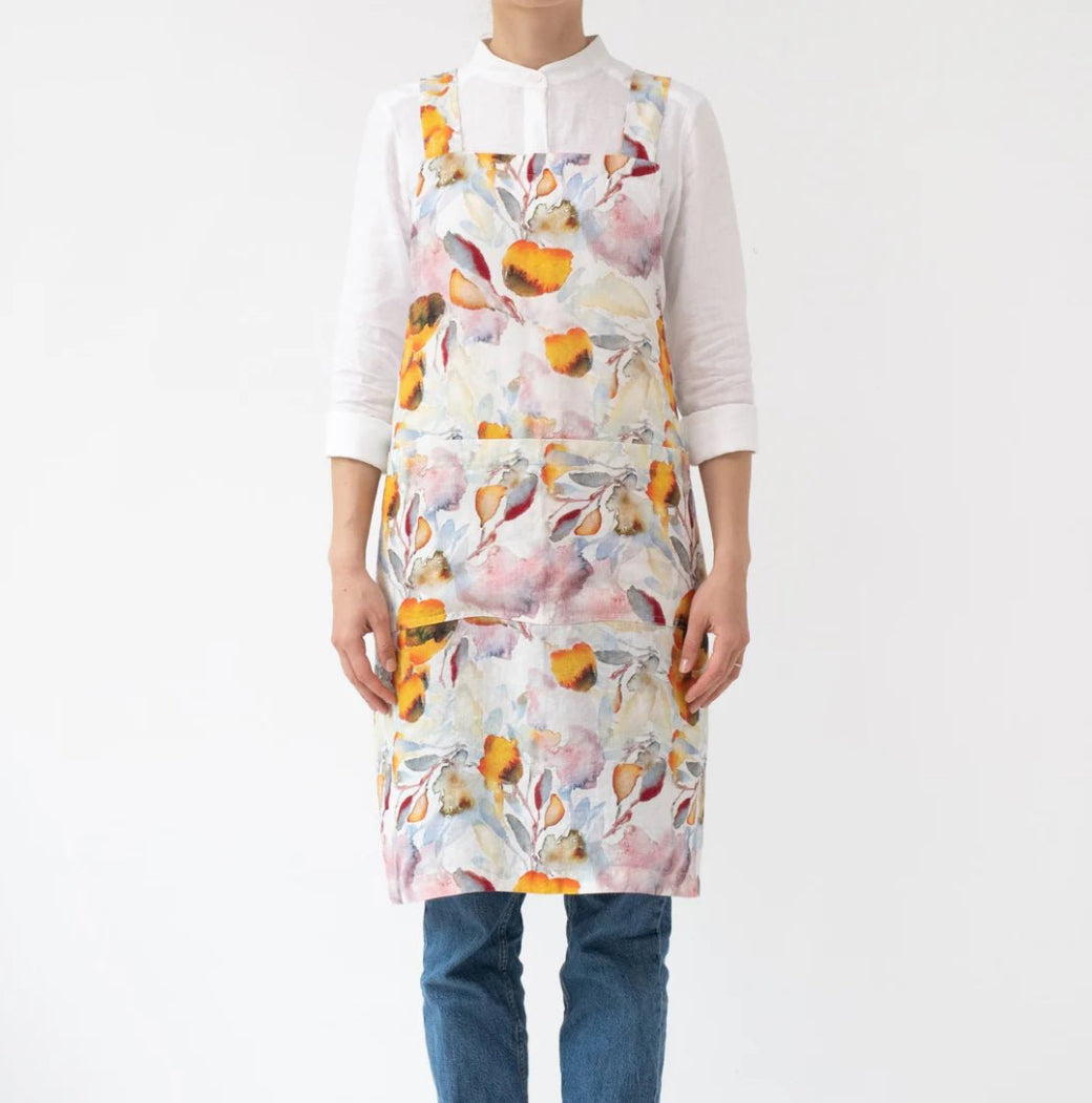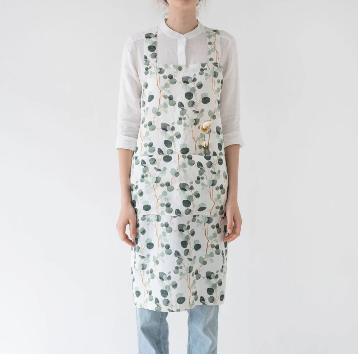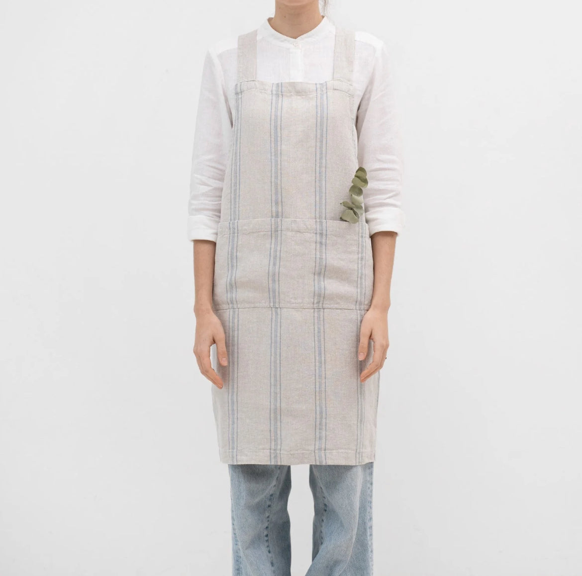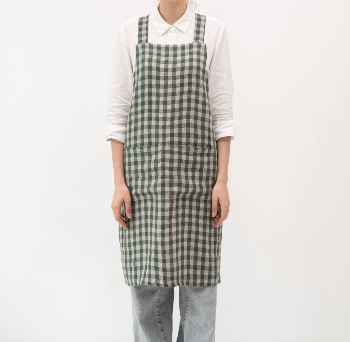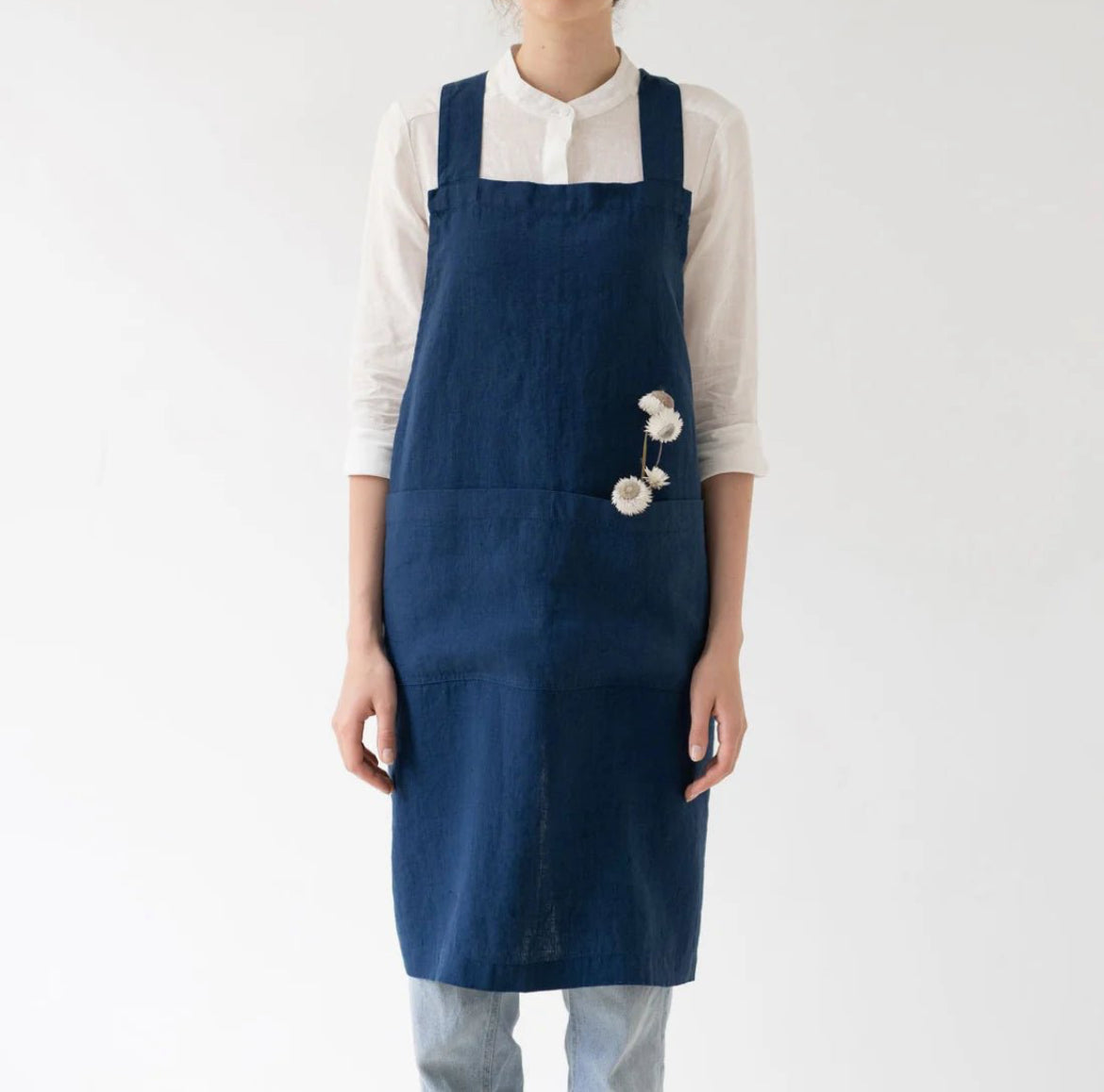 Linen Pinafore or Crossback Apron for a busy home chef. The beautiful design that cross-back around your back will keep your clothes neat and sharp while making the art in the kitchen. No adjustable ties let you smoothly put on and take off the apron in just a few seconds. It also features comfortable pockets for holding any utensils you may need to have at hand.