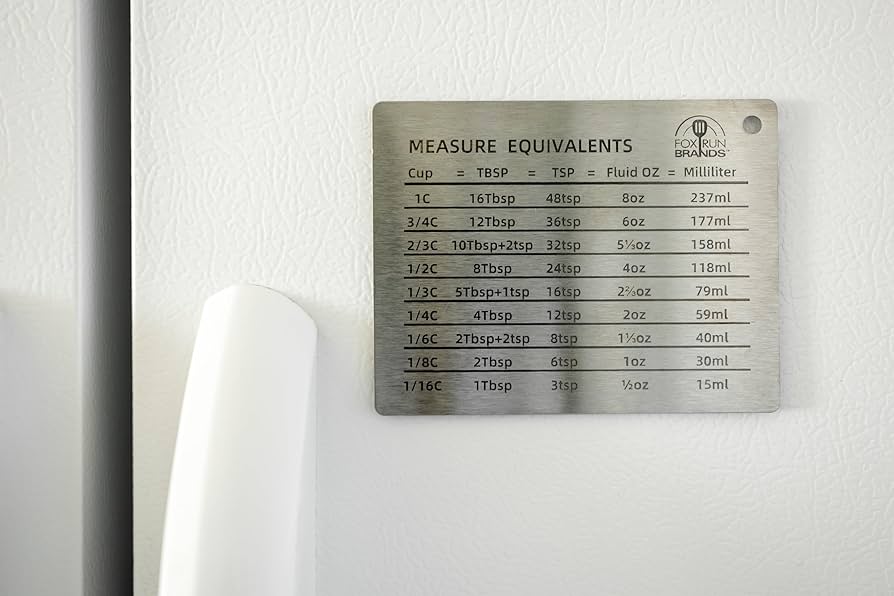 This stainless steel magnet is built to last and adds to the look of any kitchen. With this fridge magnet there is no need to clean your hands and check your phone as this measurement conversion table helps you convert cups, tablespoons, teaspoons, fluid ounces, and milliliters! Just place on any convenient magnetic surface in your kitchen and the chart will be there when you need it.