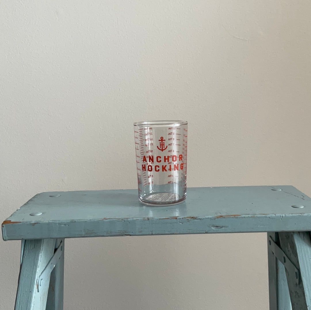 Small liquid measuring glass with red measuring guide. Perfect for any liquid measurements. Red guide in ounces, milliliters, and teaspoons. 5-ounce/150 milliliter capacity. Package dimension value is 2.25" h x 3.5" l x 2.25" w made by anchor hocking in the USA.