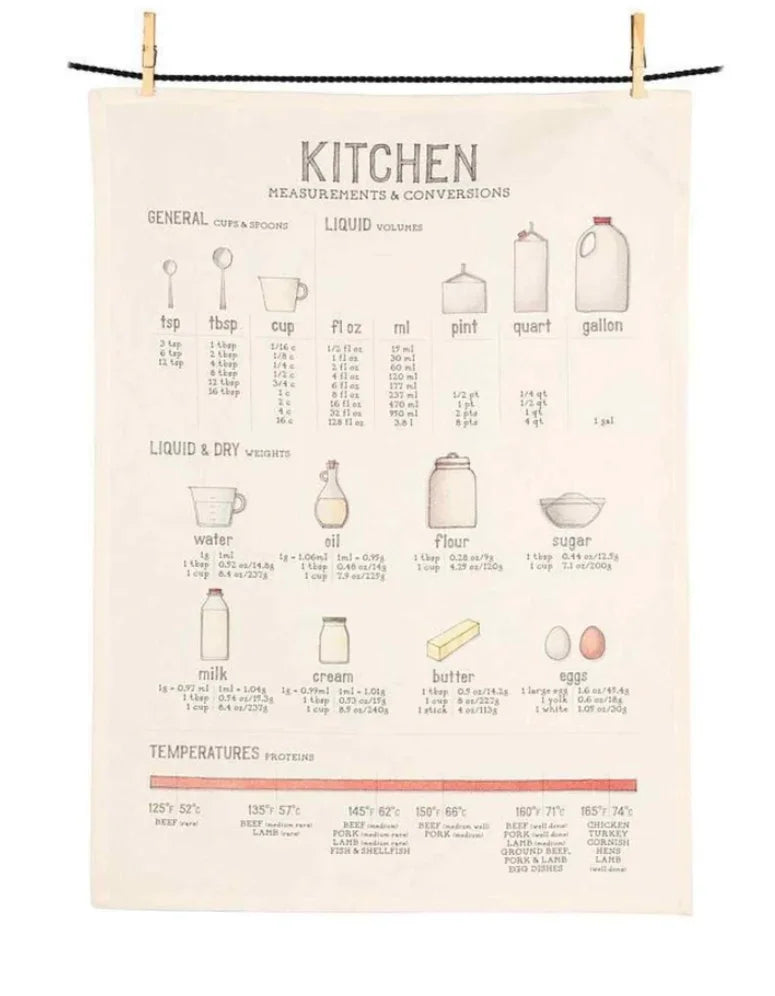 Inform while you dry with this handsome, handy Measurement Conversions Tea Towel, designed by artist Yeesan Loh. Crafted from cotton, this white kitchen towel features handy conversion guides for everything from Metric to Imperial to liquids, and every other measure you need for cooking or baking so it's as helpful as it is handy.