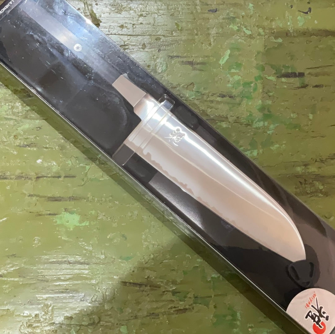 Those wishing to discover artisan knife craftsmanship with a century-old tradition, can’t go wrong with the MIYABI 4000FC knives. As with every MIYABI knife, this Santoku is also characterised by the perfect combination of beauty and sharpness. Translated, Santoku means “Knife with three virtues”, which refers to the three central areas of use: The cutting of meat, fish and vegetables is easy as child’s play, thanks to the 180-mm blade length that has been honed on both sides. The FRIODUR blade is manufactured of twofold, ice-hardened FC61 steel. As such, you have a knife of very great hardness and resilience, also when it subjected to great strain. The special steel’s great sharpness and edge holding ability are derived from the incredibly fine Katana-edge cut. Incidentally, this cut is also found with masterfully-manufactured Japanese swords. An elegant accent is provided by the mosaic pin that is found in the impregnated, dimensionally-stable Pakka wood handle. At the same time, it is also noted the MIYABI 4000FC handle and bolster are octagonally-formed. The reasons for this are not solely aesthetic in nature: With this form you also benefit from safe, comfortable handling and can work effortlessly. All MIYABI knives are “made in Japan”. For this, ZWILLING has its own manufacturing site in Seki. Here German engineering expertise from Solingen and finest East-Asian craftsmanship unite to knife masterpieces.