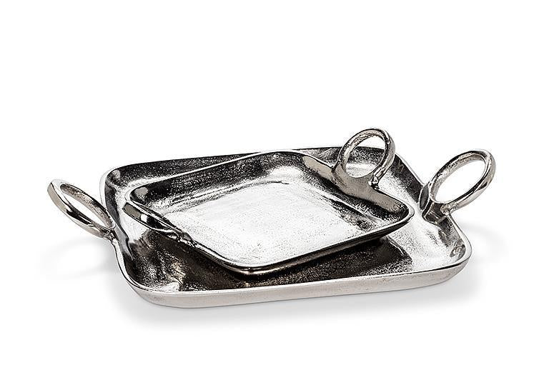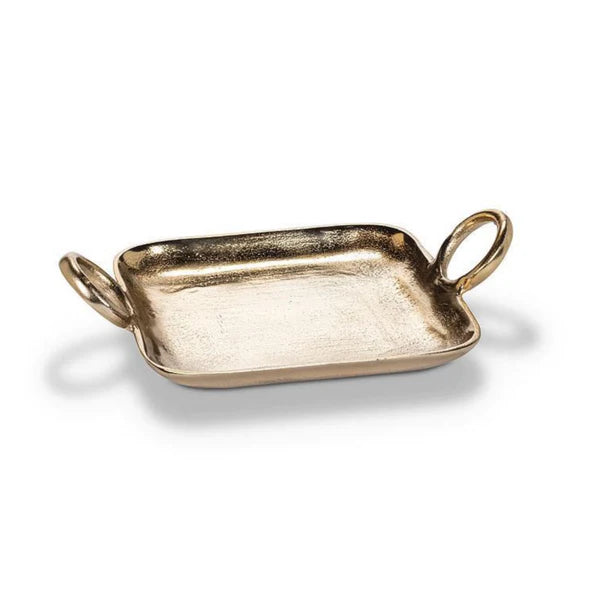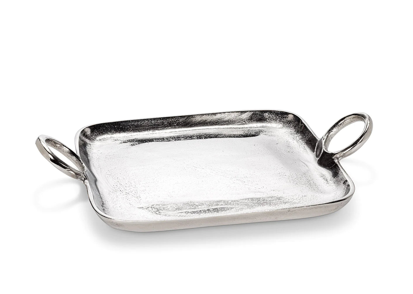 Elevate the way you serve just about anything with this chic Ring Handle Tray. Crafted out of aluminum with a beautiful, burnished gold finish or polished nickel, this elegant square tray with raised rim and small ring handles is perfect for serving coffee or dessert for one, or simply for use as a stylish pin dish for jewelry, keepsakes and more.